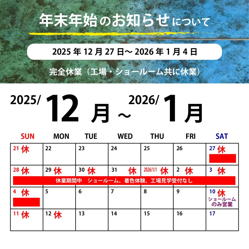 休業期間中のオンラインショップ、お問い合わせ、メール等は 1/5の営業再開後に順次対応させていただきます。